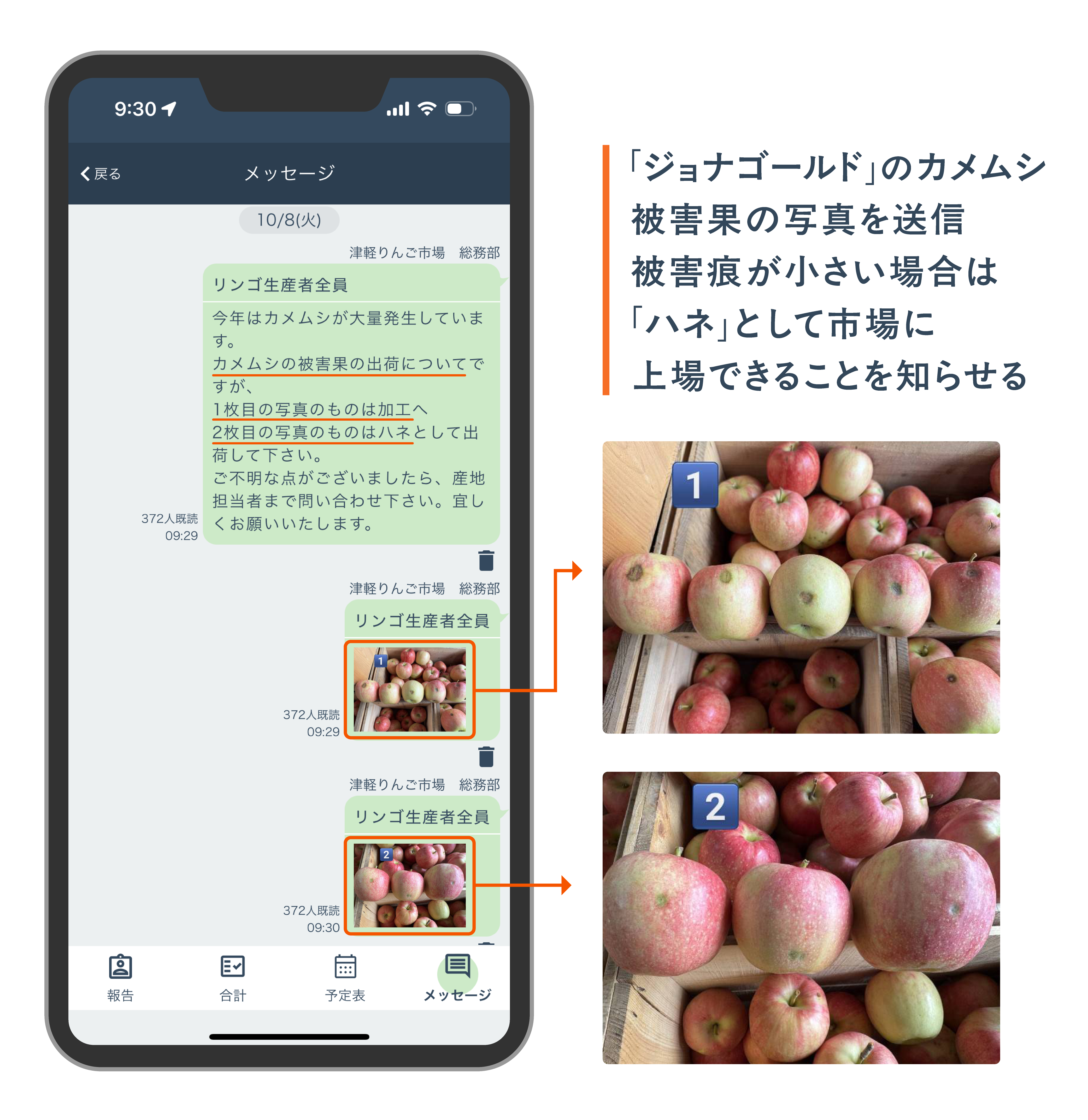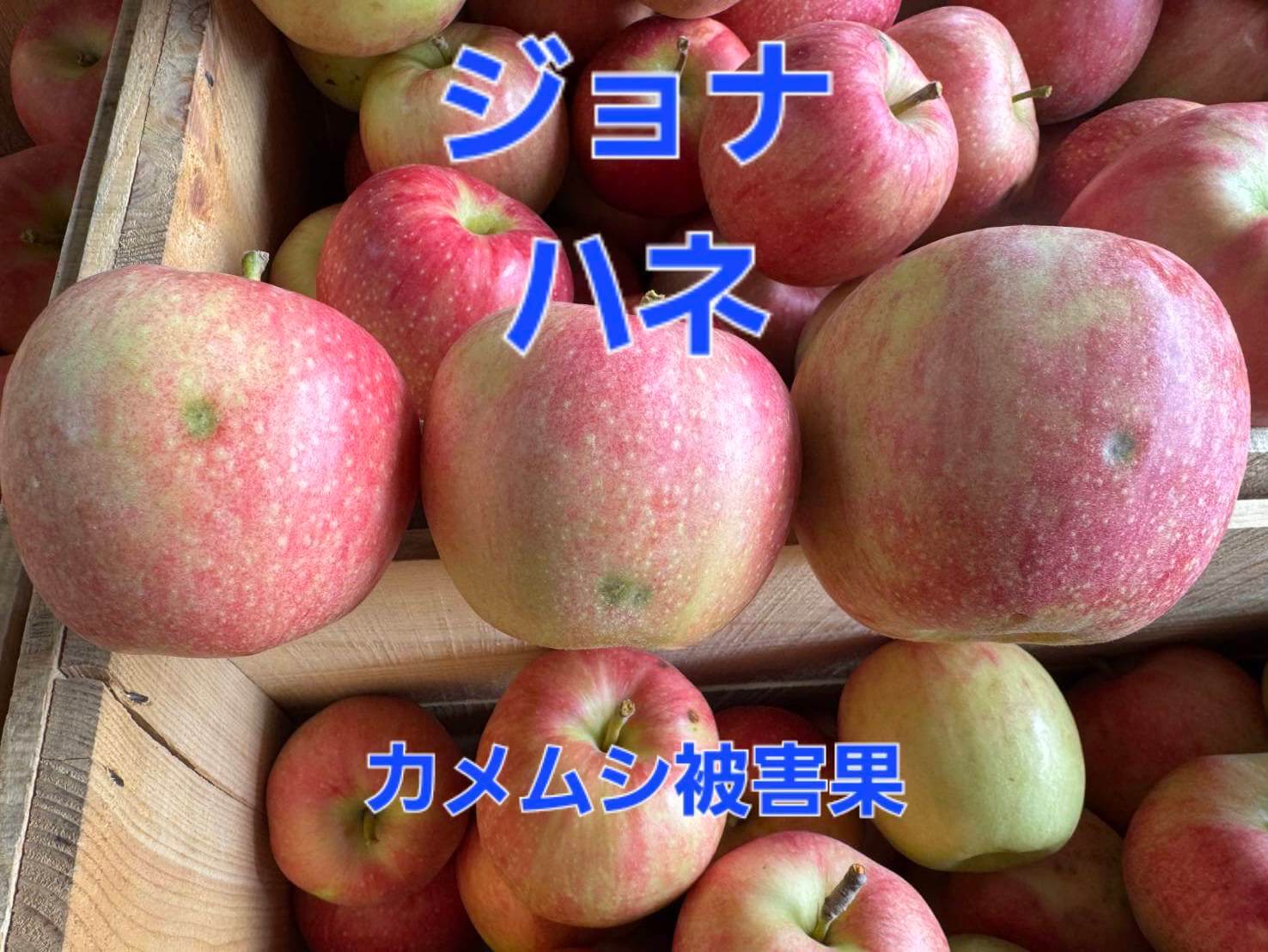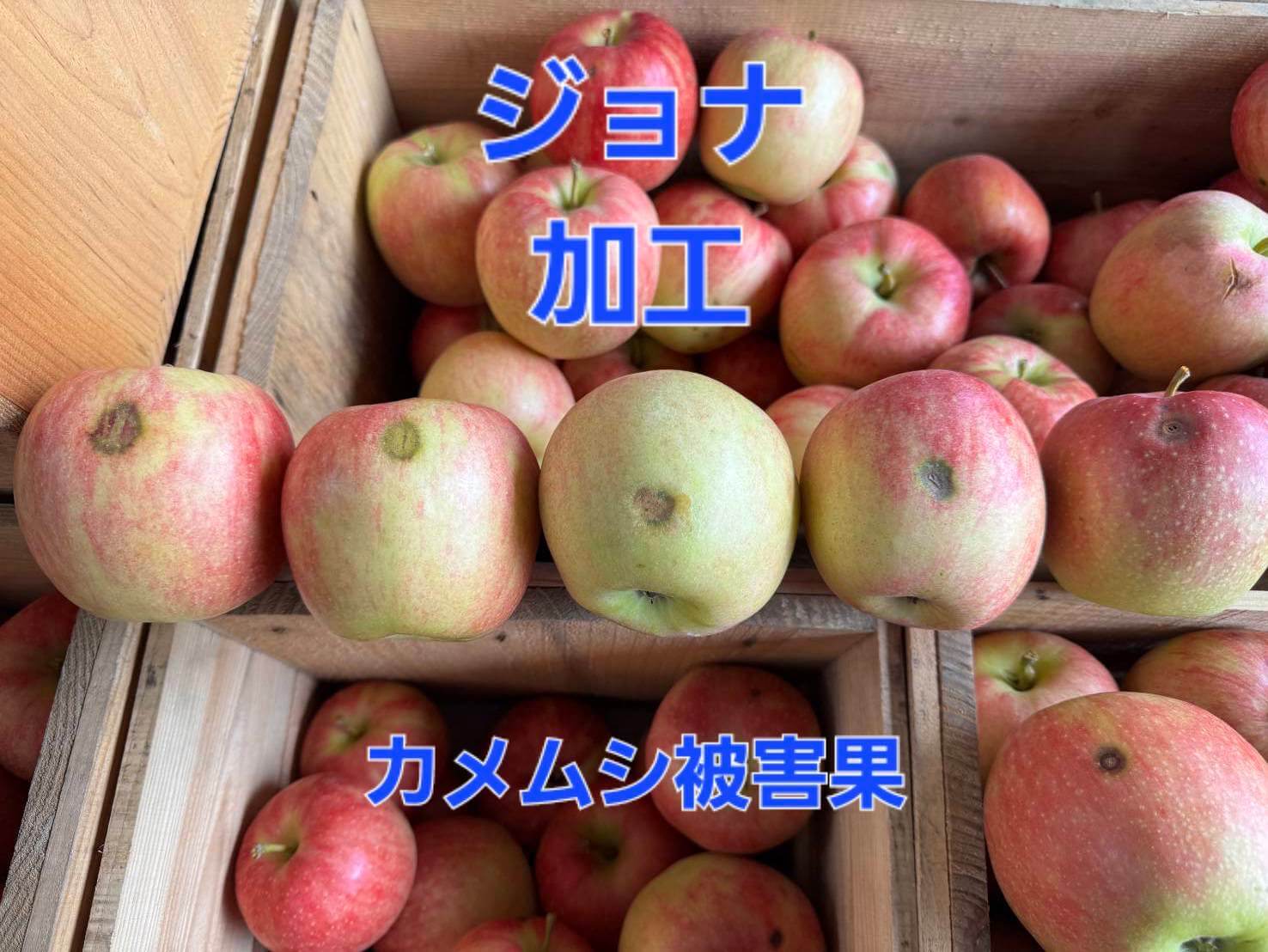 「ジョナゴールド」でカメムシ被害発生。被害痕が大きい場合は加工品(10/8の相場1,500円)扱いとなることを知らせる画像 |