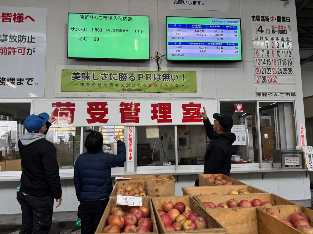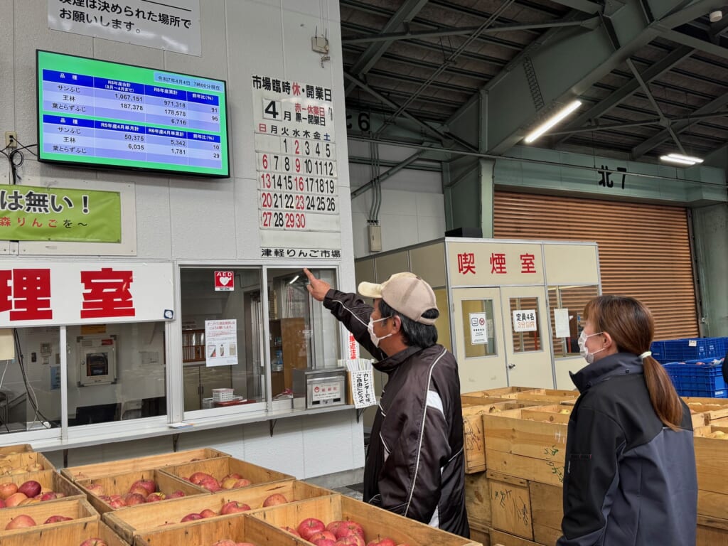 次に、2023年までの発信内容と、更新した2024年からの内容を見比べていただきます。以下の図1はホームページ(以下、HP)に掲載したもので、卸売市場内のディスプレイ(画像3)には、もう少し深掘りした情報(生産者には適期収穫や適期栽培の時期が判断できる情報、選果機を通したりんごと生産者の手選果の平均単価の差情報、買参人には仕入れ時の参考になる情報など)も掲載しています。